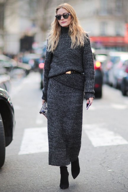 Ключевой частью образа становится трикотажная вещь. Ее можно использовать как основу зимнего гардероба, для парадного выхода или на каждый день. Трикотажным тотал-луком пользуются как сформированным нарядом. Дополняют образ вязаным шарфом или шапкой.
