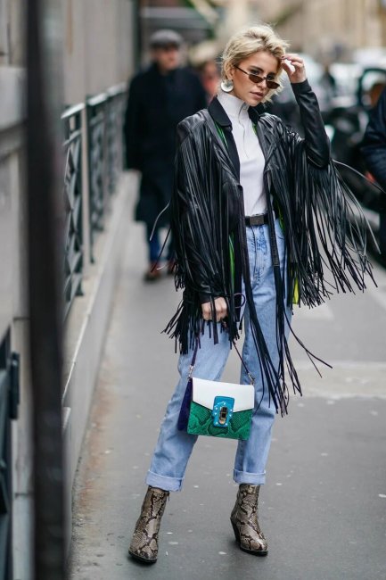 Бахрома как деталь на аксессуарах — это не дань стилю бохо, а вполне современный вариант, чтобы разнообразить вещи лаконичного дизайна. Те же сумки (миниатюрный клатч и ярко-зеленая классическая модель) с бахромой смотрятся ультрамодно.