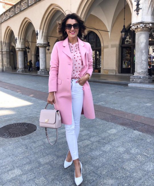 В весеннем гардеробе женщины 40 лет обязательно должны присутствовать: деловой костюм-тройка из хорошей натуральной ткани, платье в горошек или в цветочек А-силуэта, тренч оверсайз, яркое модное пальто. Эффектно выглядеть будут джинсы и брюки пастельных оттенков, платья из денима.