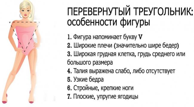 Для фигур «перевернутых треугольников» характерны узковатые бедра. Также у них широкие плечи, плоские ягодицы, средняя (большая) грудь, слабовыраженная линия талии. Представительниц этого типажа редко беспокоит избыточный вес. Жировые отложения в верхней либо нижней части тела могут быть вызваны нарушенным гормональным фоном.