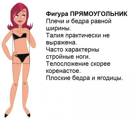 Обладательницам фигур прямоугольников практически не известны проблемы с жировыми складками. Они стройные, подтянутые, без четко «прорисованной» талии. В то же время невысокая скорость метаболизма может обернуться широкой талией, выступающим снизу животиком. Без ответственного отношения к себе привлекательные прямоугольники могут превратиться в «кубы-кирпичи».