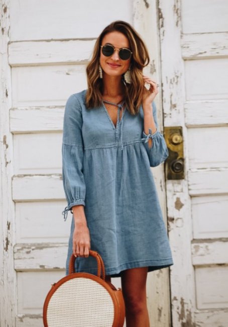 Наиболее трендовым вариантом будет в 2023 г. классическое стройнящее силуэтное платье с застежками вверху или по всей длине и с длинным рукавом. Такая модель, которую стоит дополнить джинсовым же поясом с пряжкой, идеально подойдет для прохладных летних дней или для осени.