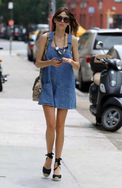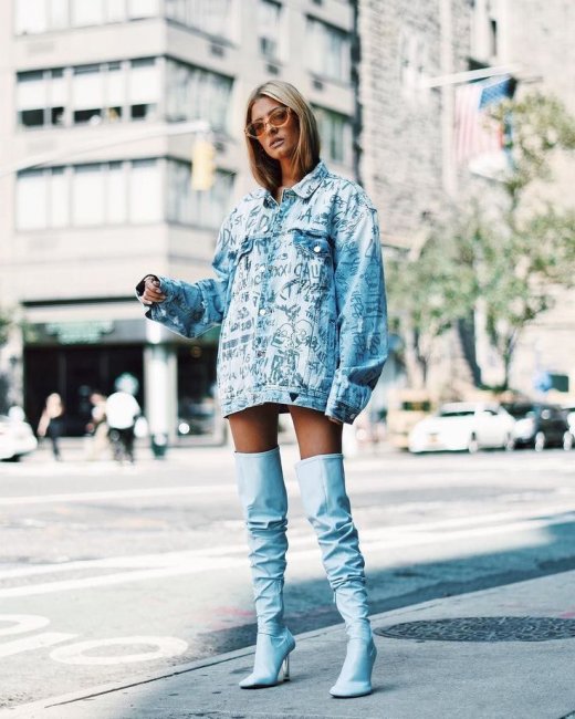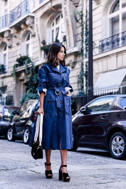 Чтобы не получить нелепый тотал-лук, джинсовое платье стоит сочетать с курткой из денима другой фактуры или цвета.