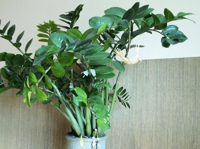 Речь идет об экзотическом африканском красавце, относящимся к семейству Ароидные, — замиокулькас замиелистный (Zamioculcas zamiifolia), имеющим распространенное народное название — долларовое дерево.