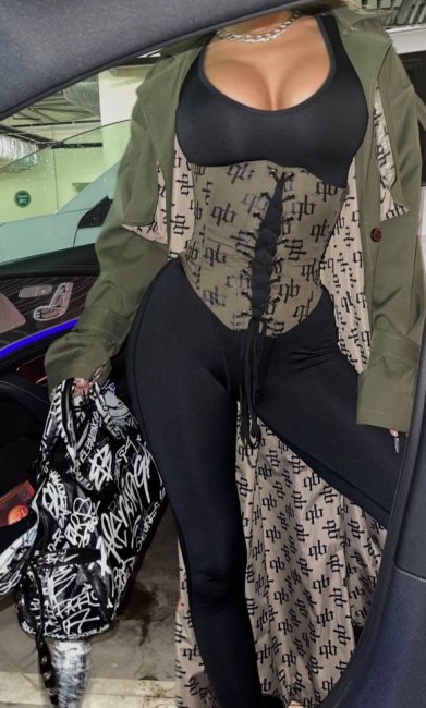 Под низ звезда надела черный обтягивающий комбинезон, который и создает актуальный Х-силуэт. Чтобы ноги кались длиннее, Ким подобрала обувь не контрастного цвета. Сапоги будто бы сливаются с комбинезоном, делая ноги бесконечно длинными. Узкий мыс удлиняет стопу, а тонкий высокий каблук делает образ изящным и женственным.