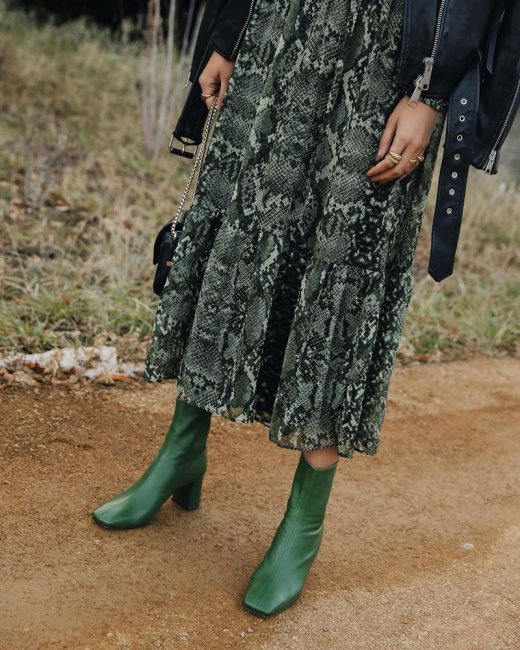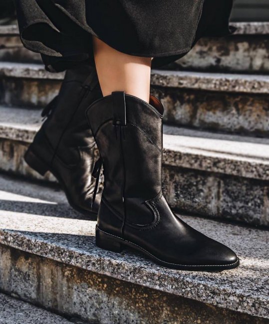 - Любительницы стиля бохо оценят ботинки-казаки. Пользуются популярностью модели на низком ходу или дополненные небольшим скошенным каблуком.