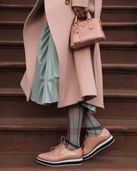 - Ботинки-оксфорды приобрели оригинальные черты с помощью дополнения утолщённой подошвой. Последнюю разрешается подобрать в разноцветном варианте, включающем несколько контрастных по оттенку полос.