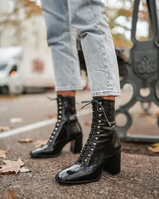 - Отсылкой к популярному в последнее время стилю ретро становятся ботинки с квадратным носком. Элегантные черты моделям придаёт дополнение тонким или квадратным каблуком.