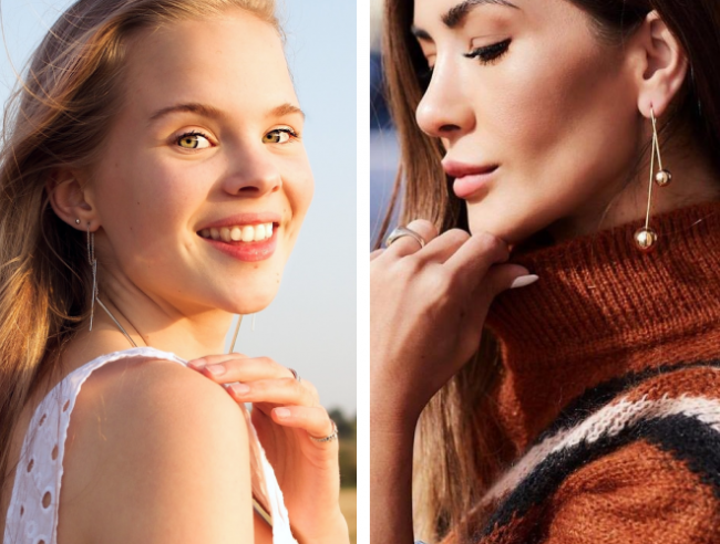 - Аксессуар способен удачно подчеркнуть форму лица или скорректировать имеющиеся недостатки. Так, круглолицым девушкам рекомендуются удлинённые серёжки. Женщинам с квадратной формой лица стоит остановиться на крупных округлых либо овальных аксессуарах. Для треугольного лица подойдут каплевидные модели или серьги, сделанные в виде подвесок. Обладательницы правильного овала смогут позволить себе любые эксперименты.
