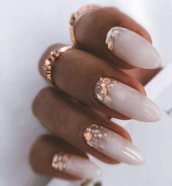 Маникюр с блесткамиФото: СоцсетиОдин из самых нежных, изящных и стильных вариантов свадебного маникюра — светлые ногти с блестящими частичками под основным цветом. Такие блестки слегка проглядывают и мерцают, становясь элегантным акцентом для образа невесты.