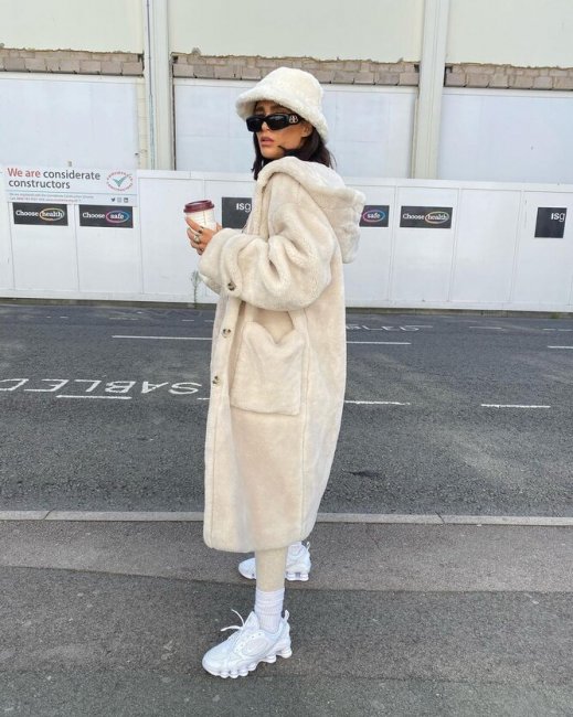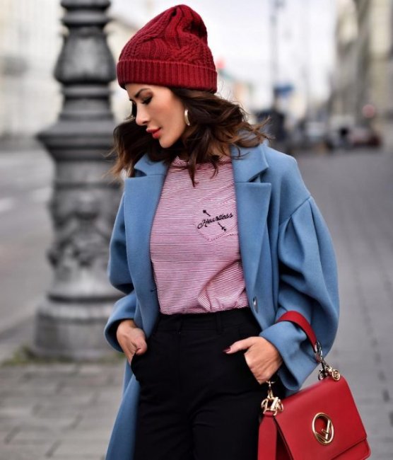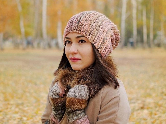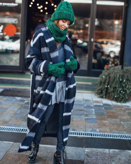 Шапки, связанные из толстых нитей, рекомендуется носить с объёмной верхней одеждой оверсайз. В качестве последней выступают пальто, куртки, пуховики и полушубки.