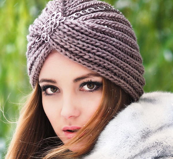 Оригинальной новинкой станет шапка-чалма, имеющая характерную форму. Передняя часть изделия может быть украшена крупной брошью, выступающей акцентной деталью. Чалма органично смотрится с кашемировыми, твидовыми, шерстяными пальто.
