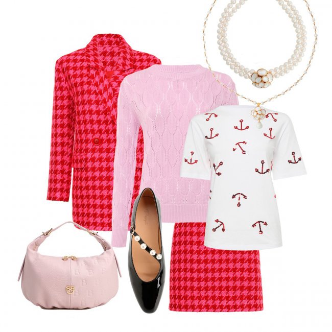 Весна – лучшее время для образа в стиле парижский шик. Его фундаментом станет твидовый костюм из юбки и оверсайз-жакета стильных розовых оттенков с принтом. Под пиджак отлично подходит белая футболка с якорями из пайеток, которая оттеняет яркость костюма и добавляет интересных деталей за счет сияния. К этой комбинации стоит выбрать балетки трендового в этом сезоне фасона Мэри Джейн с жемчужными бусинами. Вишенкой на торте станет ожерелье со стразами, которое будет мерцать и переливаться, дополняя эффект блестящей футболки. Оно идеально подойдет и для праздничного наряда, и для повседневного образа. Всегда помните, что украшения — это именно те детали, из которых складывается первое впечатление о вас.