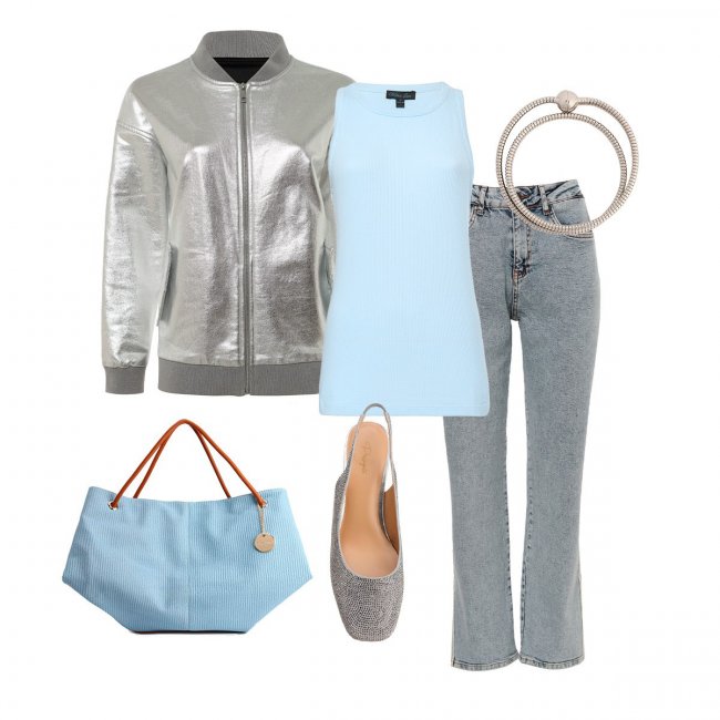 Аутфит может быть простым, но при этом выразительным. Основой будут простые джинсы прямого кроя на высокой посадке с модными потертостями. Важно выбирать изделие из качественной джинсы, которое будет прошито по всем правилам и прослужит вам не один сезон. К нему можно подобрать базовый трикотажный топ нейтрального цвета. А если замиксовать эти вещи с актуальным металлизированным бомбером в стиле спорт-шик, то это добавит комплекту драматичности. С таким луком будут отлично смотреться сверкающие туфли или ботильоны такого же цвета на невысоком каблуке. Такая обувь сразу сделает из вас модель fashion-показов и подойдет как для прогулки по городу, так и для вечернего торжества.