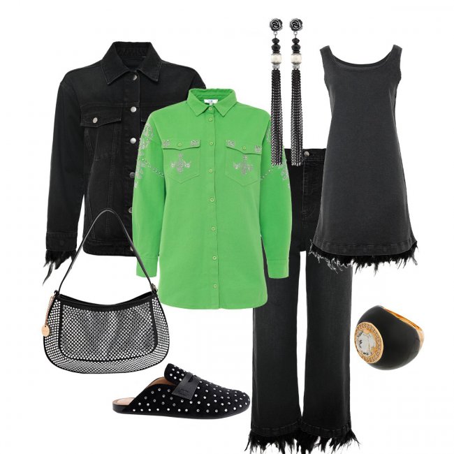 Еще один вариант образа – наряд в духе гранж. Легкая неопрятность, вызов стандартам, расслабленность и многослойность — все это легко объединить в трендовый аутфит. Первым слоем идет черная мерцающая футболка, которую поддержат дерзкие мюли в стразах. Поверх стоит накинуть яркую клетчатую рубашку оверсайз. Нотку оригинальности в лучших традициях стиля внесут джинсы-трубы и куртка черного цвета, декорированные перьями. Дополнить такой набор можно небольшой темной сумкой на плечо с ремнем-цепочкой.