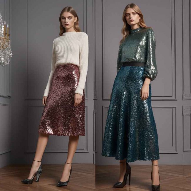 Для вечернего выхода станут находкой юбки, имеющие блестящую структуру. Последняя достигается с помощью ткани, дополненной люрексом, украшенная пайетками или изготовленная из металлизированной кожи.