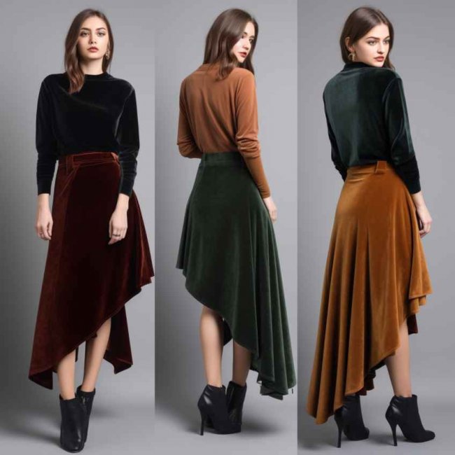 В 2023-2024 году трендовыми считаются модели с выразительными деталями. Примером служит юбка с асимметрией, создающейся за счет неравномерной длины подола. Встречаются варианты с перепадами в боковых частях. Другое решение – передняя часть, более укороченной по сравнению с задней.