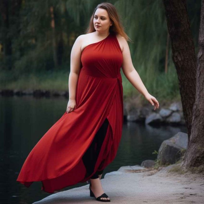 Трендовую асимметрию удастся воплотить, если выбрать платье длины макси. Уникальный дизайн можно создать самостоятельно, подвязав подол с одной стороны. Подобное решение делает менее заметной полноту девушки.