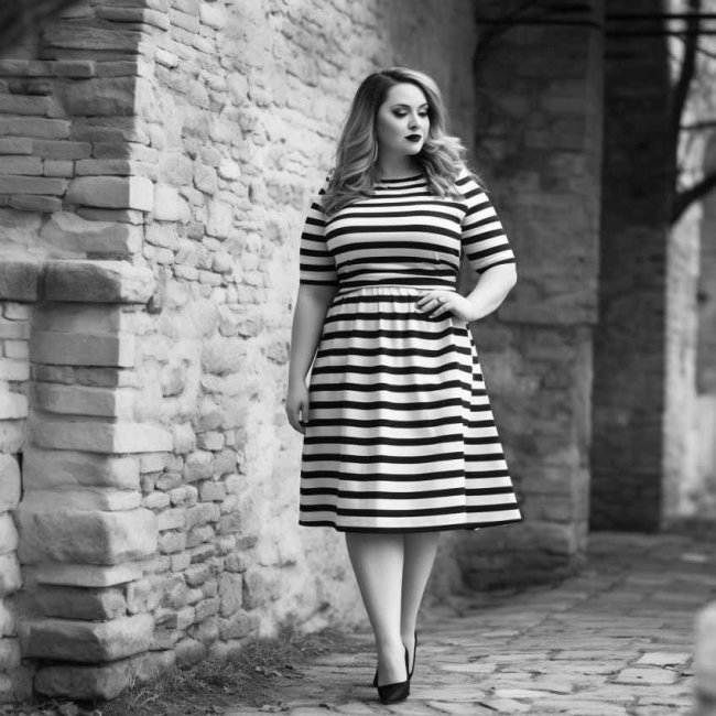 При создании моделей для полных женщин дизайнеры прибегают к распространенному приему, способствующему визуальному вытягиванию силуэта. Он заключается в выборе полосатого принта, имеющего продольное расположение. Пользуются популярностью классические черно-белые расцветки.