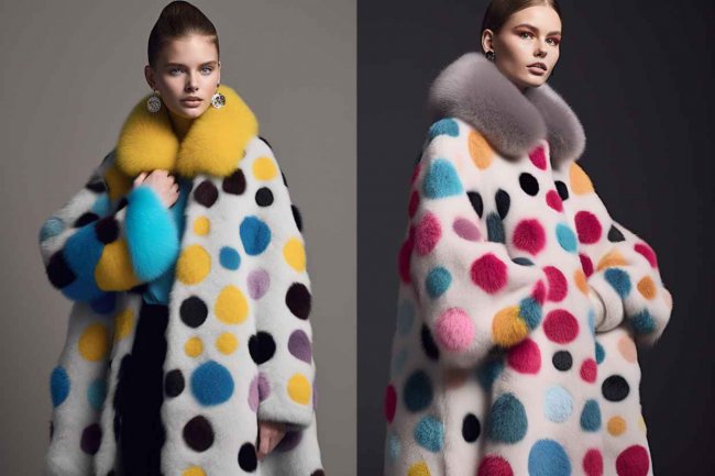 Сходство с популярным стилем ретро придаст дополнение шубы пастельных оттенков крупным рисунком в горошек, контрастирующим с основным фоном. Альтернативный вариант – украсить меховое изделие изображениями сердечек, придающих образу романтичности.