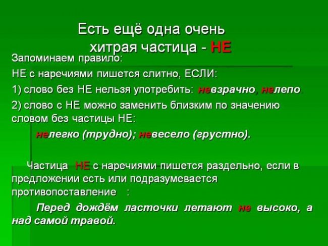 Чтобы понять, как употреблять частицу — не, вначале следует изучить правила грамматики. Не с прилагательными, наречиями употребляется раздельно, если: