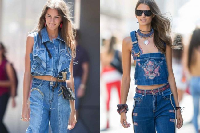 - Альтернативой привычным комбинезонам выступает джинсовый дуэт – широкие брюки и корсет, выделяющий талию. Комплект разрешается дополнить рубашкой со свободными рукавами, футболкой или полупрозрачной блузкой.