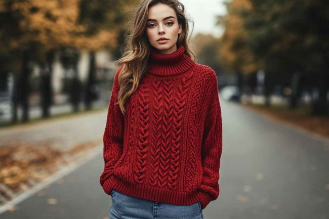 - Свитер прямого кроя и фактурной вязки в виде кос, дополненный высоким воротом под горло. Такая вещь обоснованно считается универсальной, поскольку ее можно комбинировать с разнообразными юбками, брюками и джинсами, кожаными «косухами», пуховиками, бомберами, дутыми куртками, «авиаторами».