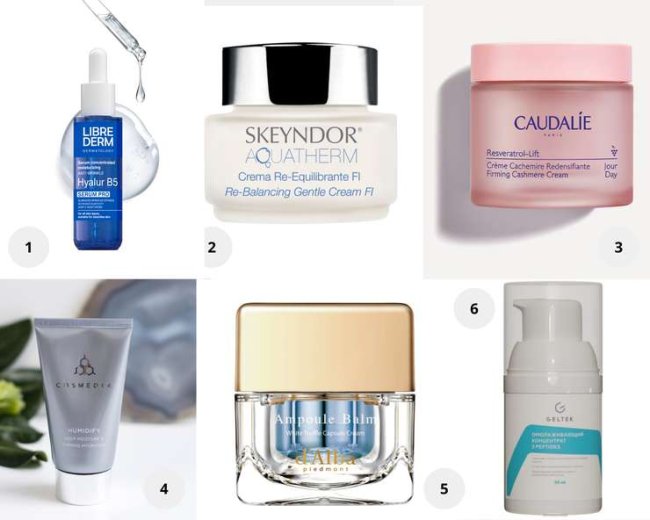 1. Сыворотка с гиалуроновой кислотой В5, Librederm. 2. Специальный антивозрастной крем в увлажняющей линии Aquatherm, Skeyndor. 3. Укрепляющий дневной крем-кашемир Resveratrol-lift, Caudalie. 4. Антивозрастной крем для глубокого увлажнения HUMIDIFY, Cosmedix. 5. Увлажняющий крем для лица White Truffle Moisturizing Cream, d’Alba. 6. Сыворотка «3D-увлажнение», Geltek.