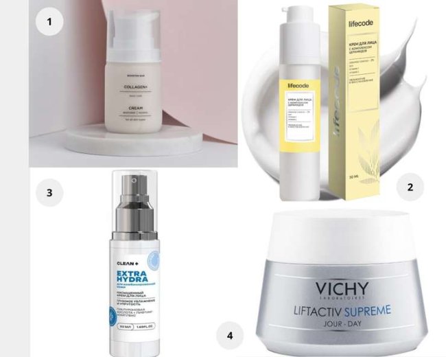 1. Крем Collagen+ ламеллярный с фосфолипидами лецитина, Booster Bar. 2. Крем для лица с комплексом церамидов, Lifecode. 3. Крем для лица увлажняющий EXTRA HYDRA, Clean+. 4. Реновация гаммы Liftactiv Supreme, Vichy.