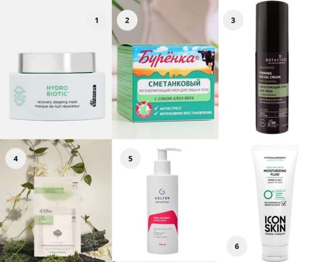 1. Ночная несмываемая маска Hydro Biotic dr.brandt. 2. Крем сметанковый с соком алоэ вера для лица и тела, Буренка. 3. Укрепляющий крем для лица CALM EXPERT с церамидами против сухости и покраснений для всех типов кожи, Botavikos. 4. Успокаивающая двойная маска для лица White Truffle Double Mask Pack (Calming), d’Alba. 5. Крем-эмолент Atopic Skin, Geltek. 6. Увлажняющий флюид для лица Aqua Balance для комбинированной и жирной кожи, включая чувствительную, Icon Skin.