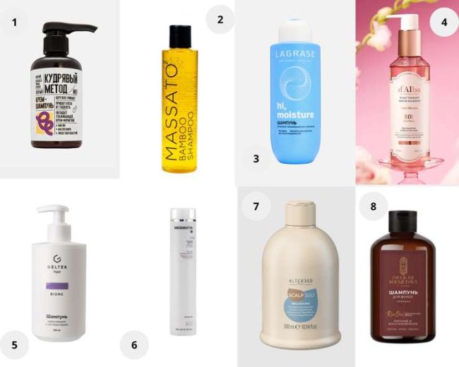 1. Крем-шампунь, Кудрявый метод. 2. Бамбуковый шампунь для объема, Massato. 3. Интенсивно увлажняющий шампунь hi, moisture, LAGRASE. 4. Шампунь для волос с ароматом фрезии Scalp Therapy Serum Shampoo, d’Alba. 5. Шампунь укрепляющий с постбиотиками Biome, Geltek. 6. VELOUR Успокаивающий шампунь для чувствительной кожи головы, Medavita. 7. Балансирующий шампунь SCALPEGO BALANCING SHAMPOO, AlterEgo Italy. 8. Шампунь для волос бессульфатный с биотином и маслом арганы, Русская Косметика.