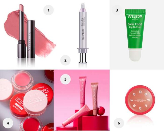 1. Помада для губ Your Lips Balm 001 First Love, Annbeauty. 2. Крем-филлер для губ Corrective, Skeyndor. 3. Питательный бальзам для губ Skin food, Weleda. 4. Ночная маска LIP LOVIN' overnight lip mask, Catrice. 5. Бальзам для губ ухаживающий The super peptide glossy, essence. 6. Питательный бальзам с коллагеном, DR.F5.