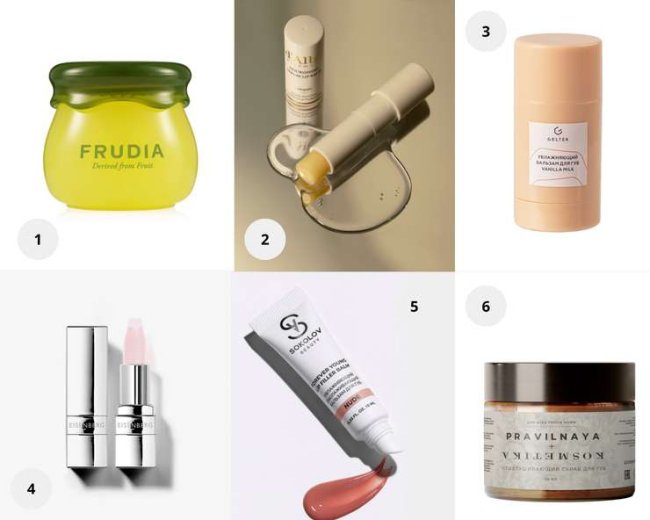 1. Восстанавливающий бальзам с авокадо, Frudia. 2. Питательный бальзам для губ White Truffle Nourishing Serum Lip Balm, d’Alba. 3. Увлажняющий бальзам для губ Vanilla Milk, Geltek. 4. Бальзам для губ Baume Fusion, EISENBERG. 5. Бальзам для губ увлажняющий, омолаживающий, SOKOLOV. 6. Отшелушивающий скраб для губ, Pravilnaya Kosmetika.