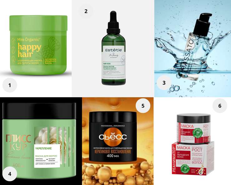 1. Укрепляющая маска для густоты волос Happy Hair, MISS ORGANIC. 2. Лосьон-сыворотка против выпадения волос, стимулирующий их рост, Hair SOS ESTETIE. 3. Сыворотка для кончиков волос, Massato. 4. Маска Роскошь волос Укрепление, Глисс Кур. 5. Интенсивная маска для поврежденных волос «Кератиновое восстановление», СЬЁСС. 6. Реаниматор Маска укрепляющая от выпадения и для роста волос, Лошадиная сила.