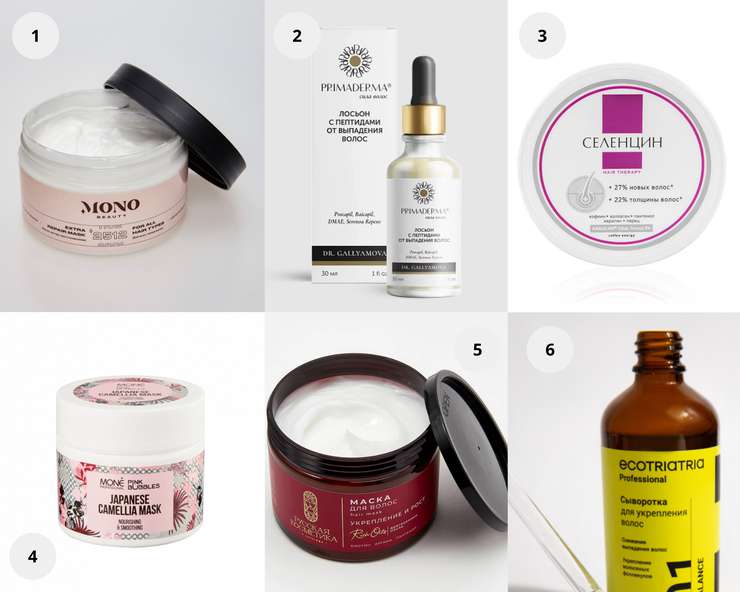 1. Маска экстра-восстановление для волос, MONO Beauty. 2. Лосьон с пептидами от выпадения волос, PRIMADERMA. 3. Маска против выпадения волос, Селенцин. 4. Питательная маска с маслом японской камелии Japanese camellia mask, MONE Professional. 5. Маска для волос Укрепление и рост, Русская Косметика. 6. Сыворотка для укрепления волос, Ecotriatria Professional Balance, ECOTRIATRIA.