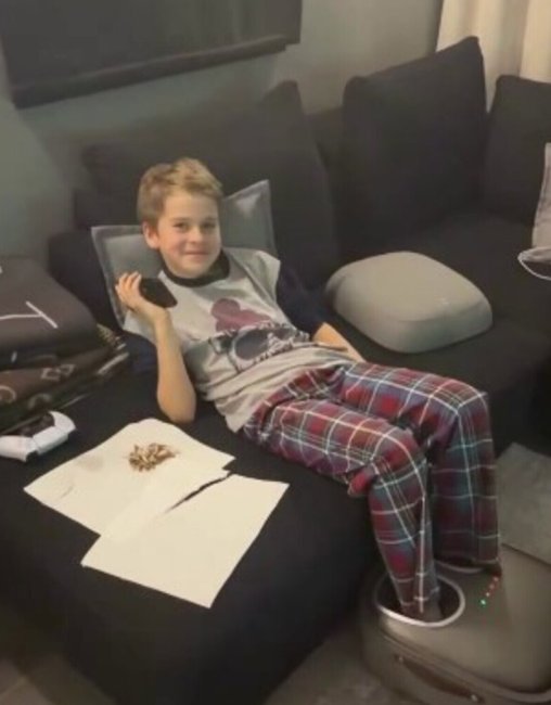 Исполнитель запечатлел наследника за телевизором. Мальчик вальяжно расположился на диване, погрузив свои ноги в специальный аппарат для массажа. Никита наслаждался просмотром футбола и поглощением семечек.