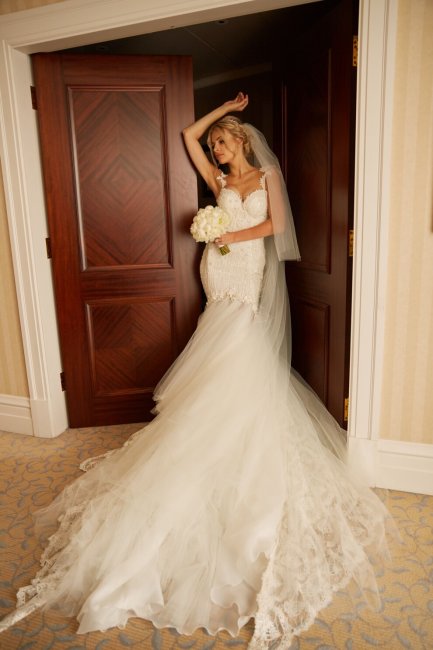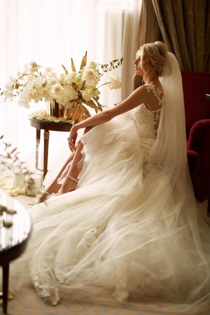Свадебное платье Влады СеданНадеть подвенечное платье этого легендарного бренда мечтают невесты по всему миру, и Влада стала одной из них. Она выбрала женственное и элегантное платье-рыбку с подчеркнутой линией декольте и длинным сложным шлейфом. Платье из коллекции Lе Secret Royal I под названием Ms. Elle было вдохновлено образом королевского белого павлина и украшено роскошной вышивкой, кристаллами и жемчугом. Образ дополнила лаконичная белая фата и сверкающий обруч.