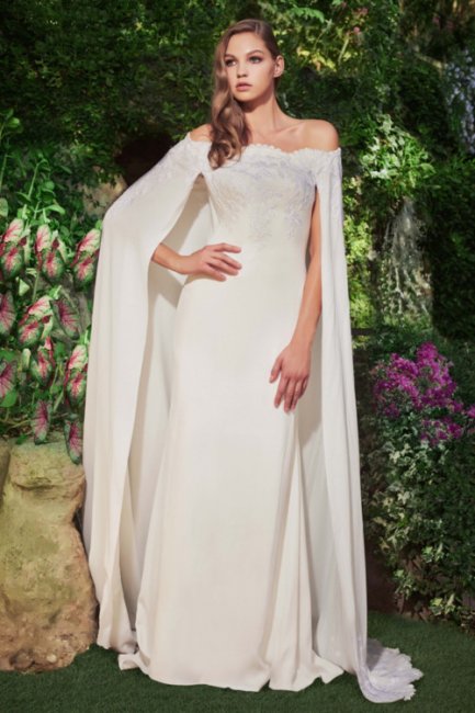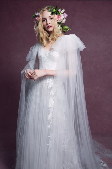 Дизайнеры продолжают эксперименты со свадебной фатой, предлагая всевозможные альтернативные варианты. Следующим летом набирают популярности кейпы – некий гибрид фаты и свадебных накидок. Galia Lahav показали белоснежные лаконичные кейпы с маскулинной линией плеча, Berta Bridal – полупрозрачные модели, украшенные перьями и жемчугом, а Marchesa совместили тренд на полупрозрачность и объемные мужские плечи в своей коллекции. Тем временем, Zuhair Murad и Tadashi Shoji соединили кейпы и свадебные платья в одно целое.