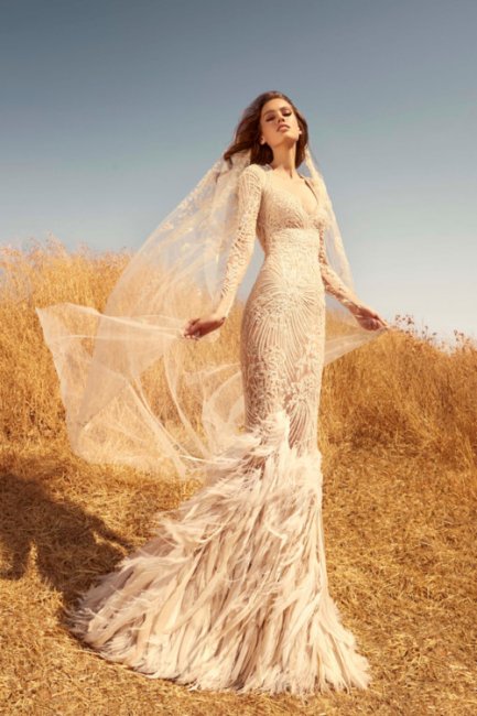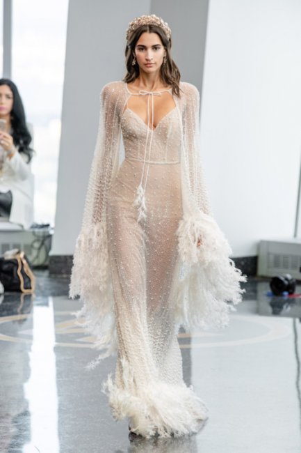 Деликатный декор в виде нежных перьев и жемчужин разного диаметра в следующем сезоне украсит как элегантные торжественные наряды, так дерзкие мини-платья, подходящие для свадебной afterparty. Искать необычные платья с таким декором стоит в коллекциях Zuhair Murad, Amsale, Lela Rose, Vera Wang и Berta.