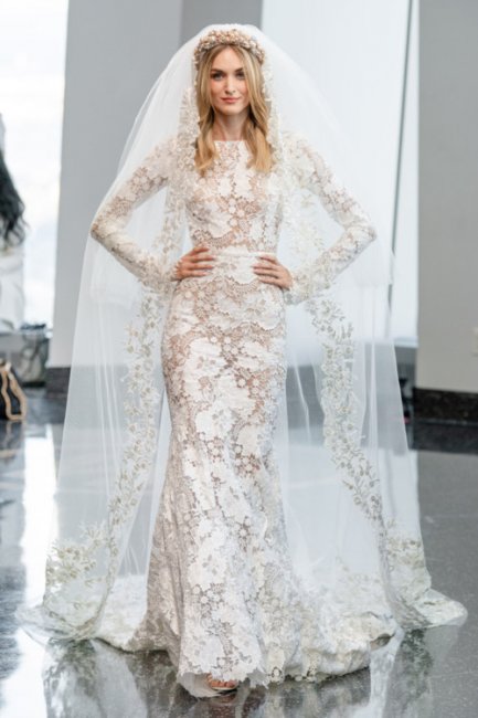 Многие бренды в новом сезоне построили свои свадебные коллекции, используя тонкое кружево, нежную вышивку и цветочные аппликации. Роскошные растительные узоры украсили романтичное силуэтное платье Oscar de la Renta, Monique Lhuillier обратились к крупным принтам на пышных образах, а Berta добавили к гипюровому платью свадебную фату, щедро украсив ее кружевом.