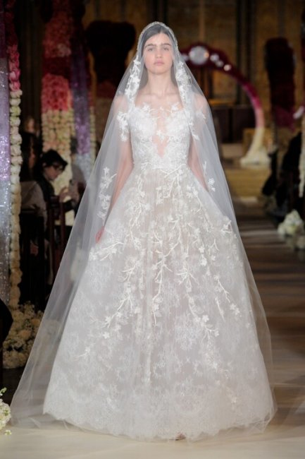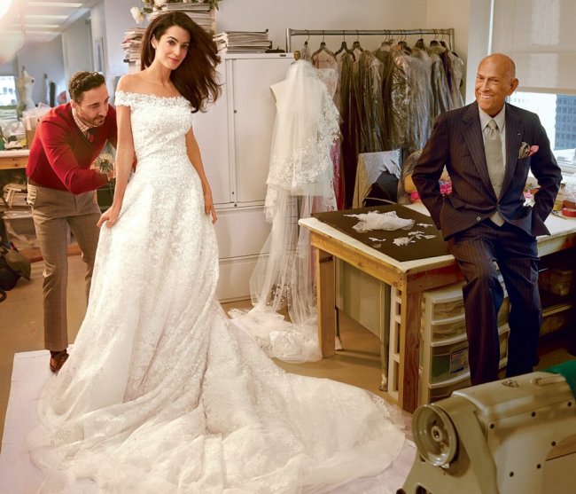 Свадьба Амаль и Джорджа Клуни, 2014Дизайн главного платья в своей жизни Амаль Клуни доверила в руки легендарного кутюрье Оскара де ла Ренты. Так, свадебное платье классического кроя состояло из 12 метров нежного французского кружева и деликатного тюля оттенка слоновой кости, в котором Амаль выглядела как настоящая принцесса. Невеста предпочла модель с открытыми плечами и деликатным лифом, расшитым вручную сотнями миниатюрных бусин и элегантным жемчугом. Свадебный образ продолжила эффектная вуаль, украшенная по подолу кружевом шантильи и вышивкой из бисера и хрусталя. Этот свадебный образ стал последним в портфолио дизайнера. Оскар де ла Рента умер 20 октября 2014 года.