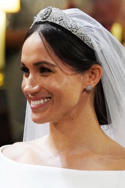 Венчальный головной убор невесты – это бриллиантовая тиара, которая ранее принадлежала королеве Марии Текской, бабушке королевы Елизаветы II, и которую последняя передала для церемонии Меган Маркл. Она была создана в 1932 году, а центральный камень датируется 1893 годом. Также на свадебную церемонию Меган Маркл надела браслет и для торжественного ужина серьги ювелирного Дома Cartier.