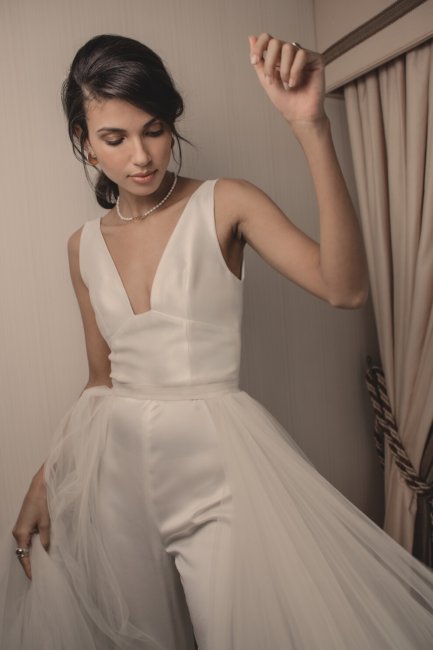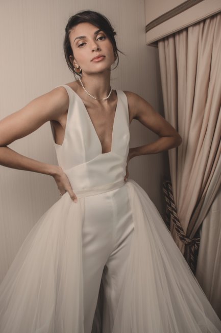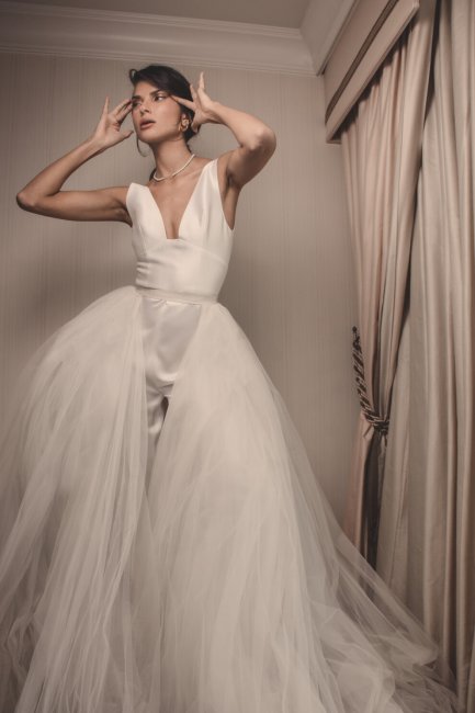 Этой осенью возможно все, даже сочетание максимализма и минимализма в одном образе. Именно поэтому поклонницы длинных шлейфов и пышных юбок из фатина, отсылающих к нарядам принцесс, а также девушки, предпочитающие лаконичный дизайн, смогут этой осенью удивить гостей на свадьбе новым нестандартным образом. Так, немецкий бренд Kaviar Gauche представил элегантный атласный комбинезон со съемной многоярусной юбкой из фатина, которая бесспорно рассказывает историю о торжественности.