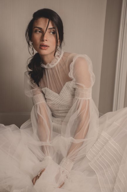 Объемные рукава, высокие воротники, оборки, рюши и нежное кружево - все это отличительные черты викторианского стиля, который этой осенью добрался до свадебных коллекций. Романтичное и богемное настроение винтажного стиля удалось удачно передать бренду Dana Harel. Дизайнер представила свадебное платье из полупрозрачной белой сетки с воздушными рукавами буфами, высоким воротником-стойкой и корсетом, расшитым мелким бисером. Такой самодостаточный образ хорош тем, что он не требует эффектных украшений. Можно добавить в уши лишь жемчужные серьги.