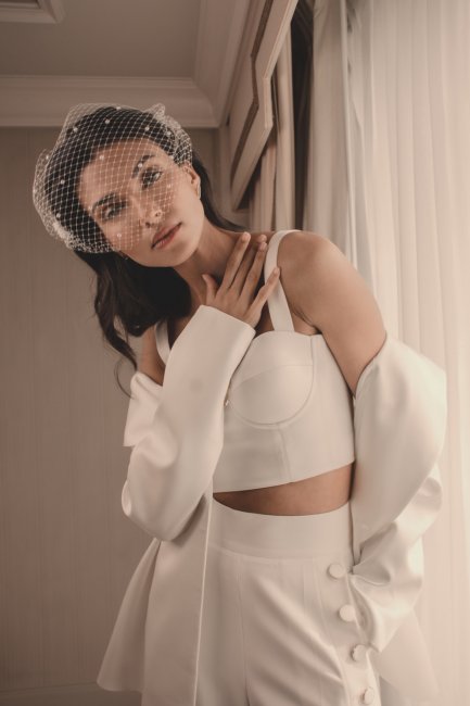 Костюм Total White, серьги Sabrina Dehoff, вуаль Jeonga Choi Мини