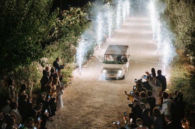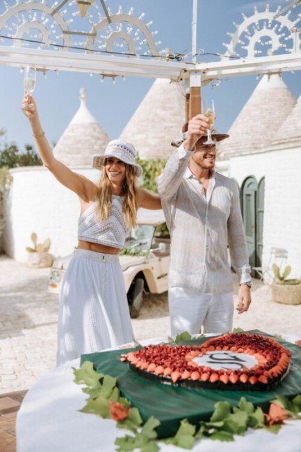 Воскресный бранч прошел на территории курортной резиденции Tenuta del Lauro в Локоротондо, принадлежащей матери Джакомо Тане. Вместе с Даниэлой Веккьо они организовали мероприятие, которое завершило торжество местными блюдами под народный танец пиццика. Перевозил молодеженов одной локации в другую Citroën Méhari — отреставрированный ретро-автомобиль отца жениха с салоном, отделанным тканями Missoni.