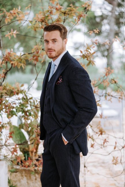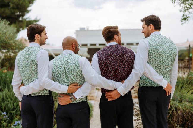 Для церкви жених выбрал текстуру с культовым зигзагом, характеризующуюся сочетанием черного, темно-синего и шалфейно-зеленого оттенков. Дополнительными деталями стали жилет и клатч из шелкового твила с забавным принтом в виде перца чили и именами пары. Такие же жилеты, но с другим принтом (а именно с главными героями вечерней мизансцены, то есть ароматическими растениями. — Прим. ред.) — для свидетелей.