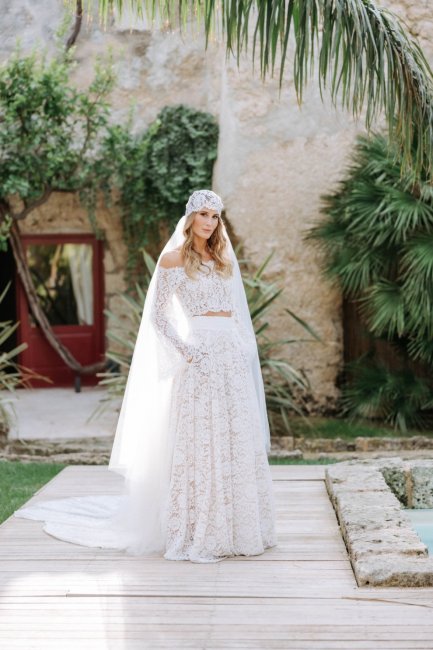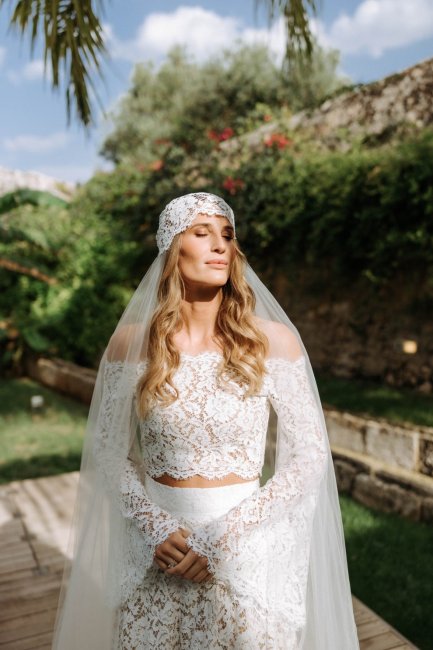 Но давайте перейдем к наряду невесты в этот день, которое, по ее собственному желанию, отличалось от классических вечерних платьев. Активная и свободолюбивая Сильвия обратилась к своему другу, стилисту и модельеру Альберто Калири, который разработал для невесты платье, сшитое по эскизу в одном из туринских ателье. Сильвия выбрала образ, состоящий из кружева цвета слоновой кости с открытыми плечами и животом, который идеально подходил ей.