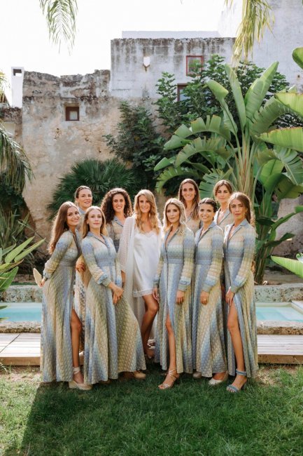 Макияж невесты был решительным, но не навязчивым. Сильвия выбрала бронзовый смоки айс и матовую помаду цвета капучино. Что касается свидетелей, то супруги подумали и о подружках невесты: для них были сшиты на заказ платья Missoni из тканей, идеально гармонирующих с красками природы и неба. Больше фотографий со свадьбы Джакомо Миссони и Сильвии Торраса смотрите в нашей галерее.
