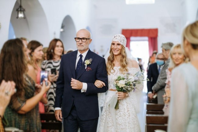 Однако эта локация заиграла новыми красками с появлением невесты. Выход Сильвии сопровождала радуга и две тысячи белоснежных бумажных бабочек, которые гости подбрасывали вверх вместо риса. Еще один приятный сюрприз — неожиданное выступление певца Аль Бано. У выхода из церкви он исполнил захватывающая интерпретация легендарной песни Felicità и Ave Maria Шарля Франсуа Гуно. Но это было еще не все. Несмотря на масштабность мероприятия, на празднике царила атмосфера семейного теплого ужина. Так, например, почтив традицию создания свадебных венков, Сильвия сплела украшение на голову из стручков перца чили.